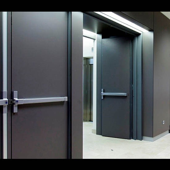 Las puertas cortafuego son puertas de metal que se instalan para evitar la propagación de un incendio mediante un sistema de compartimentación y para permitir una rápida evacuación del edificio. También se las conoce como puertas RF (Resistentes al Fuego). Están fabricadas con dos chapas de acero y paneles de lana de roca en su interior. A las puertas cortafuego se les realizan pruebas para verificar si realmente resisten un incendio de ahí el otorgamiento la homologación para el comercio de las mismas. Según el tiempo que resista el ensayo se clasificará en RF 30, 60, 90, 120 minutos.